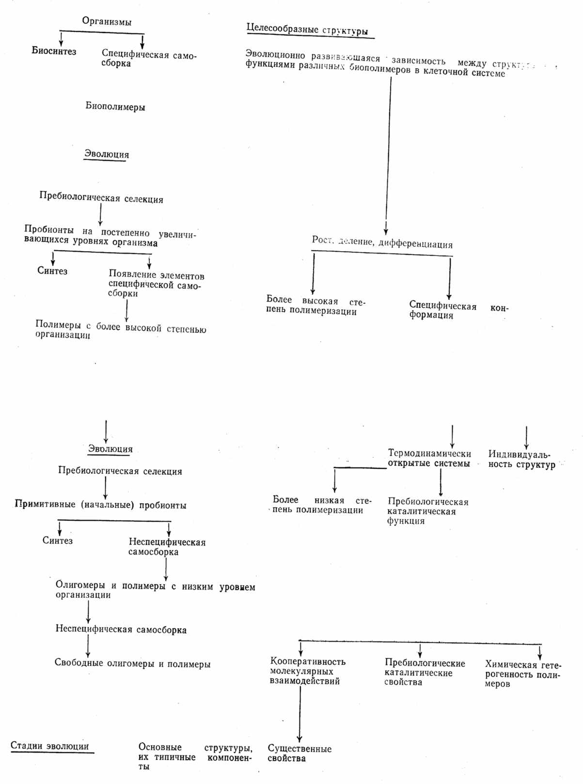 На ранних стадиях химической эволюции репликация нуклеиновых кислот и синтез полипептидов происходили, вероятно, без органического катализа, хотя уже на этом этапе, по-видимому, существовали источники энергии типа АТФ. Однако появление полипептидов с ферментативными свойствами резко ускоряло матричный синтез полинуклеотидов и белков и знаменовало собой переход от химической эволюции к биологической [Fox S., Nakashjma Т., 1980]. К этому времени, по-видимому, относится появление белково-липидных мембран, отделявших первичные формы жизни от окружающей среды. Возможно, на этой стадии химической эволюции аутокаталитические процессы стали пространственно локализоваться на первичных мембранных белково-липидных структурах с участием полисахаридов и полинуклеотидов. Моделью таких структур являются коацерваты, в которых могли протекать гетерокаталитические реакции [Опарин А. И., Гладилин К. Л., 1980]. Здесь кончается химическая эволюция и начинается эволюция биологическая (рис. 1).