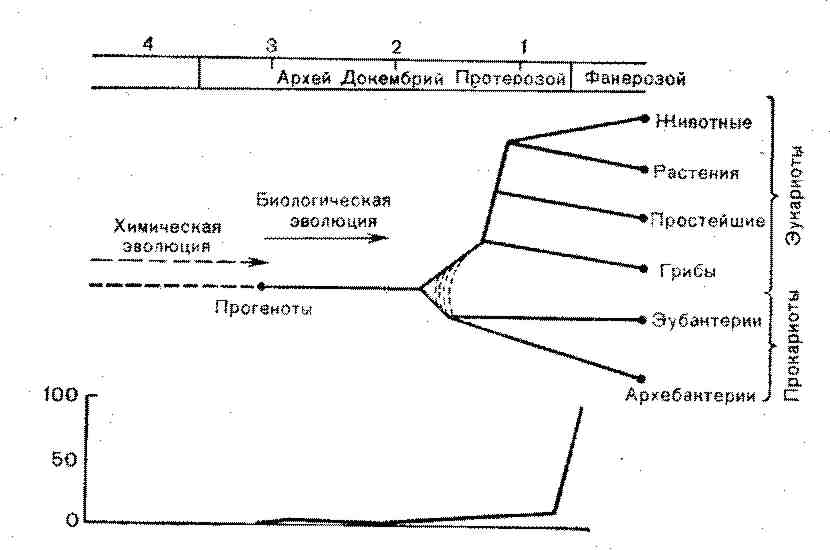 Рис. 1. Химическая и биологическая эволюция. По оси абсцисс—возраст (млрд лет); по оси ординат: вверху — эволюция органического мира, внизу—содержание кислорода в атмосфере (% к современному уровню).