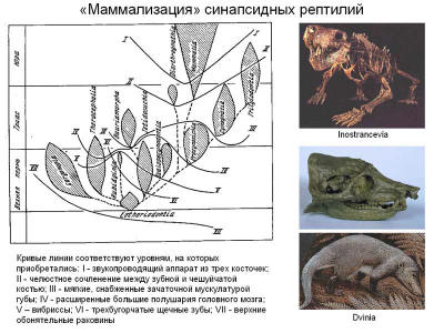 Одной из первых хорошо изученных «заций» такого рода стала маммализация – процесс постепенного, параллельного приобретения признаков млекопитающих разными группами тероморфных (синапсидных) рептилий. Этот процесс охватывает позднюю пермь и почти весь триас, т.е. порядка 30-40 млн. лет. Большой вклад в изучение этого процесса внес Л.П.Татаринов, в прошлом – директор нашего института. На схеме видно, как разные линии тероморфных рептилий параллельно приобретали маммальные признаки. Моменты приобретения этих признаков – то есть моменты выхода на очередной новый уровень – показаны здесь семью изогнутыми линиями.