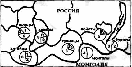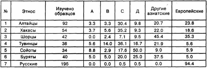 Нами* был собран и изучен материал, характеризующий генофонд следующих тюркоязычных народов Сибири: алтайцев, хакасов, шорцев, сойотов (5). Последние - очень малочисленный народ, обитающий в Бурятии, западнее Байкала. Результаты представлены на рис. 1 и в табл. 3. В ней же для сравнения приведены данные, характеризующие генофонд русских. Данные этой таблицы показывают, что все тюркоязычные народы Сибири и Центральной Азии, как и буряты, имеют в своем генофонде типы А, В, С, D мтДНК. Суммарная частота этих типов наиболее высока у тувинцев и сойотов. У них, как и у бурятов, наименьшая частота европеоидных типов. Наиболее смешанным, азиатско-европеоидным, генофондом среди изученных оказался генофонд шорцев.