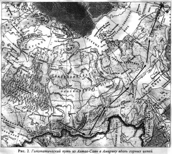то есть двигались вдоль горных цепей. При взгляде на физическую карту северо-востока Азии ясно вырисовывается гигантская дуга хребтов, идущая от Алтая до Чукотки. Это Саяны, Хомар-Дабан, Яблоновый хребет и параллельные ему хребты, тянущиеся вдоль восточного берега Байкала, Становой хребет, Джугджур, Колымское и Чукотское нагорья - естественный маршрут к Аляске, а дальше - по Скалистым горам вдоль всей Америки (рис.2).