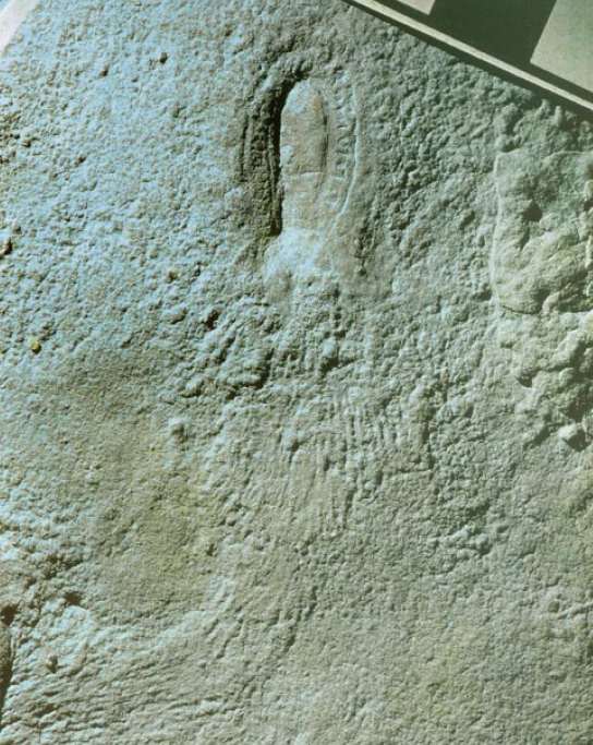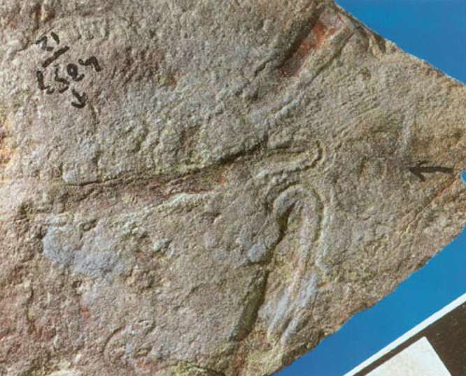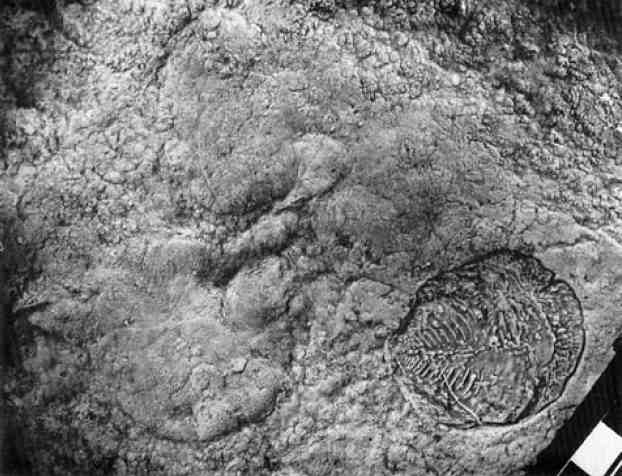 Figure 8. Yorgia, body fossil preserved in a negative relief on the undersurface of the Vendian sandstone about 555 Ma old, Zimnii Bereg (Winter Coast) of the White Sea, Russia. Courtesy of A. Yu. Ivantsov. Collection of the Paleontological Institute, Russian Academy of Sciences. White and dark scale bars represent 1 cm.