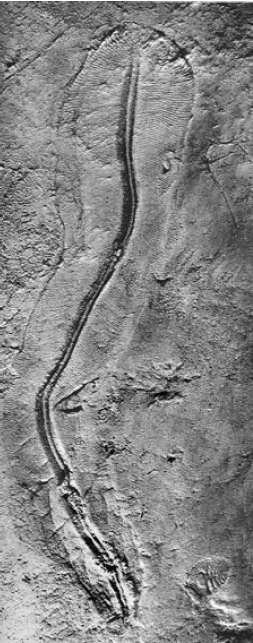 More recently Gnilovskaya (1998) published a description of the new genus Parmia (Figures 6, 7), which increases the diversity of worm-like creatures inhabiting the ocean during the Late Riphean well before the Ediacara fauna. Over 80 specimens have been collected from a core from a borehole drilled in southern Timan, northeast of the Russian Platform. With a maximum length up to 60 mm and a body width up to 2.5 mm, these organisms show a regular homonomous segmentation (7-11 segments per millimeter of body length). Parmia is interpreted as a probable predecessor of the annelid worms. All geological and paleontological evidence (including the representative microfossil assemblage) indicates that the age of Parmia may be about 1 Ga (Gnilovskaya et al., 2000). Although the exact age of Sinosabellidites and Parmia is yet to be determined, these metazoan fossils are certainly much older than the Ediacara-type invertebrates known from the Vendian Period.
