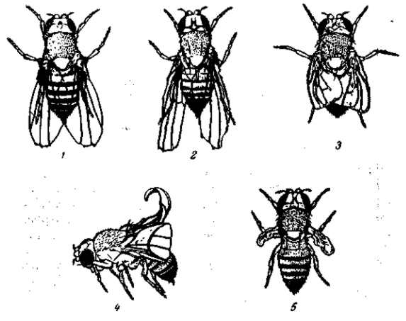 Рис. 1. Некоторые мутации Drosophila melanogaster, выражающиеся главным образом в нарушении нормального строения крыльев. 1 — Notch, 2 — Beaded, 3 — rudimentary, 4 — curled, 5 — vestigial. Все самки. По Т. Моргану, 1919, и Т. Моргану и др., 1925