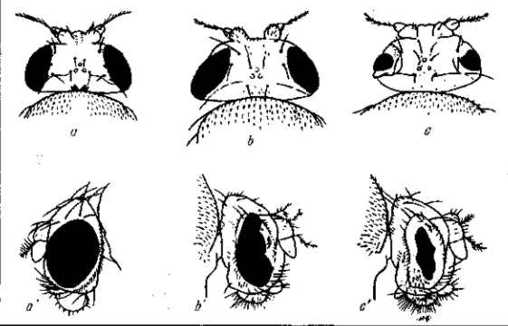 Р и с. 6. Доминантная мутация полосковидных глаз Ваг у Drosophila melanogaster. Выражение этой мутации сильно меняется в зависимости от температуры, при которой воспитывались личинки. а, а' — нормальные глаза; с, с' — полосковидные глаза; b, b' —гетерозиготная мутация. По Т. Моргану, 1919