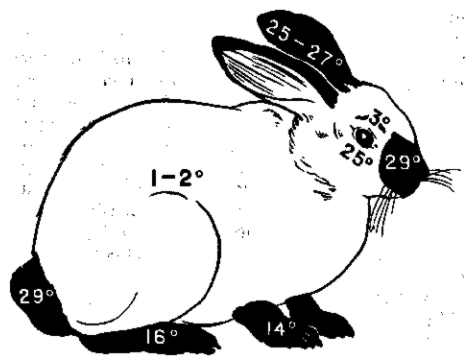 Рис. 8. Распределение температурных порогов пигментообразования в волосах горностаевого кролика. По Н. А. Ильину, 1926 — 1927